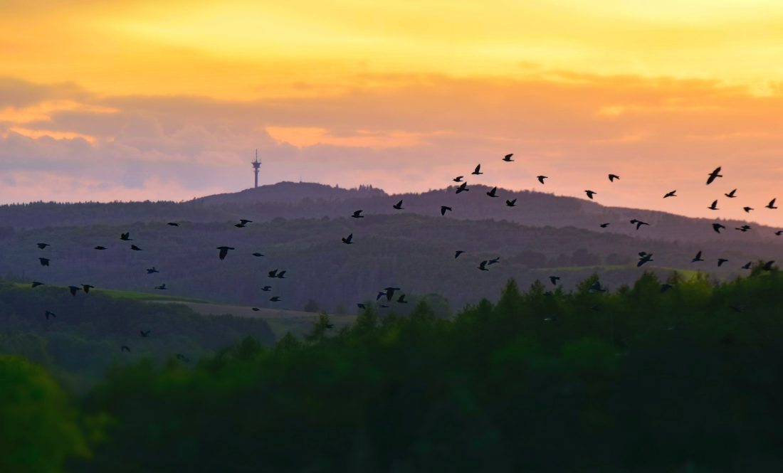 Description: Der Eisenberg mit Fernmeldeturm im Abendlicht mit seinen grünen Wäldern und im Vordergrund ein Schwarm Krähen