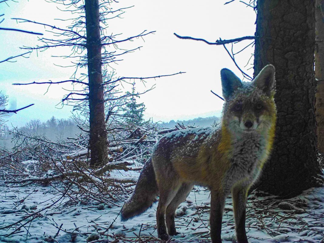 Description: Das Foto habe ich in unserem Privatwald mit Hilfe einer Wildkamera erstellt. Es ist somit eine Zufallsaufnahme. Ich finde es besonders schön weil der Fuchs genau für diese Aufnahme so schön still steht. Ich habe oft Fotos die nicht klar zu erkennen sind, da das Tier sich bewegt. Im Hintergrund und auf dem Fell des Tieres der Schnee der Anfang April hier oben im Knüll nochmal gefallen ist.