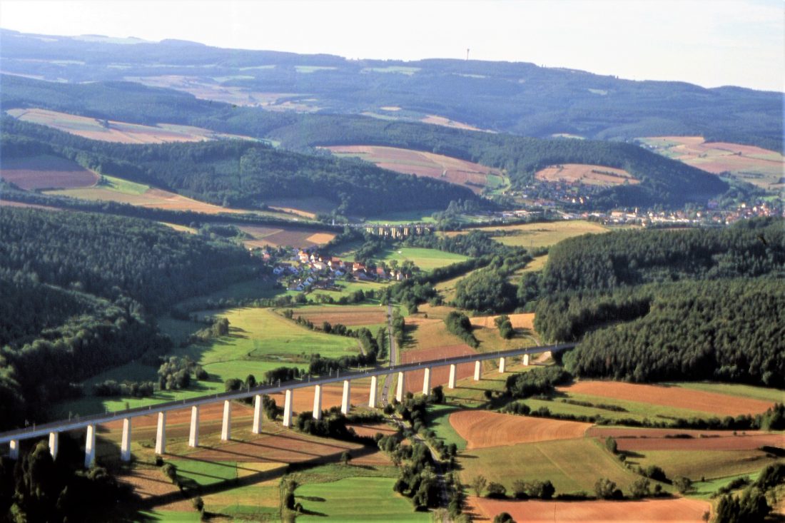 Description: Blick ins Aulatal mit Schnellbahn- und Autobahn mit den Ortschaften Kleba und Kirchheim. Im Hintergrund ist der Turm vom Eisenberg zu sehen.