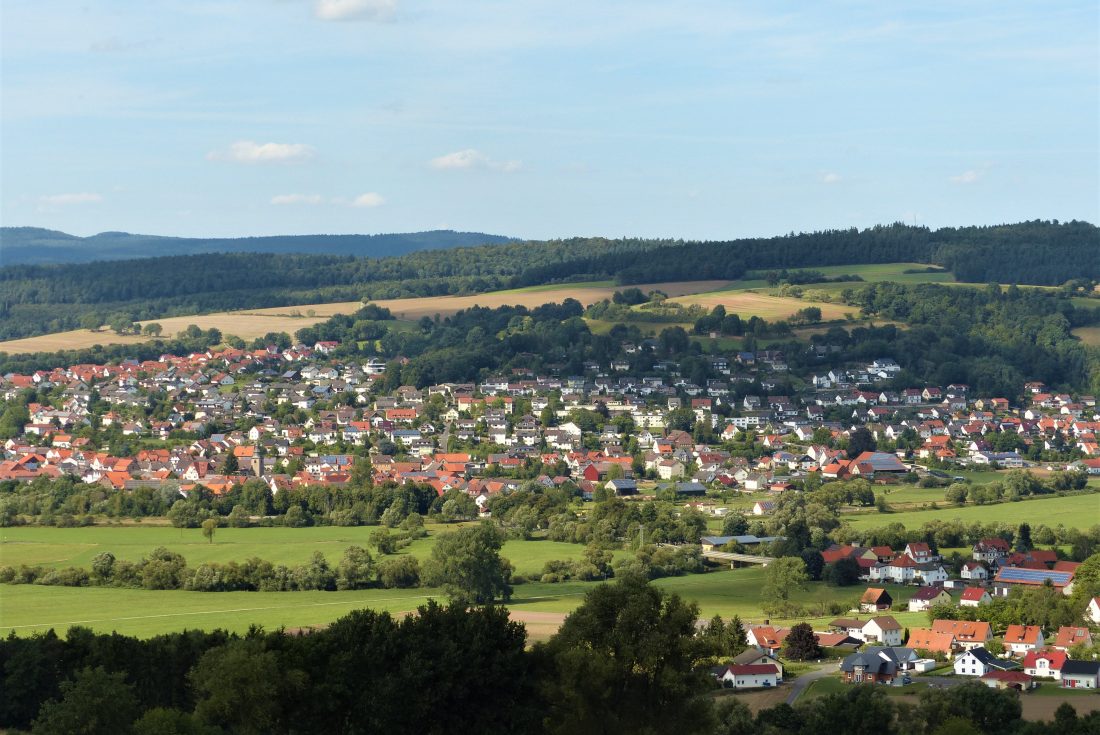 Description: Die Marktgemeinde Niederaula ohne Industriegebiet. Im Vordergrund teil von Mengshausen. Aufgenommen von Mengshausen aus.