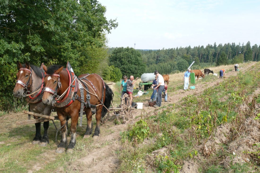 Description: Krotoffelernte wie es früher einmal war. Pferde mit Kartoffelroder und die ausgeroderten Kartoffeln werden von Hand ausgelesen und in Säcken gesammelt.