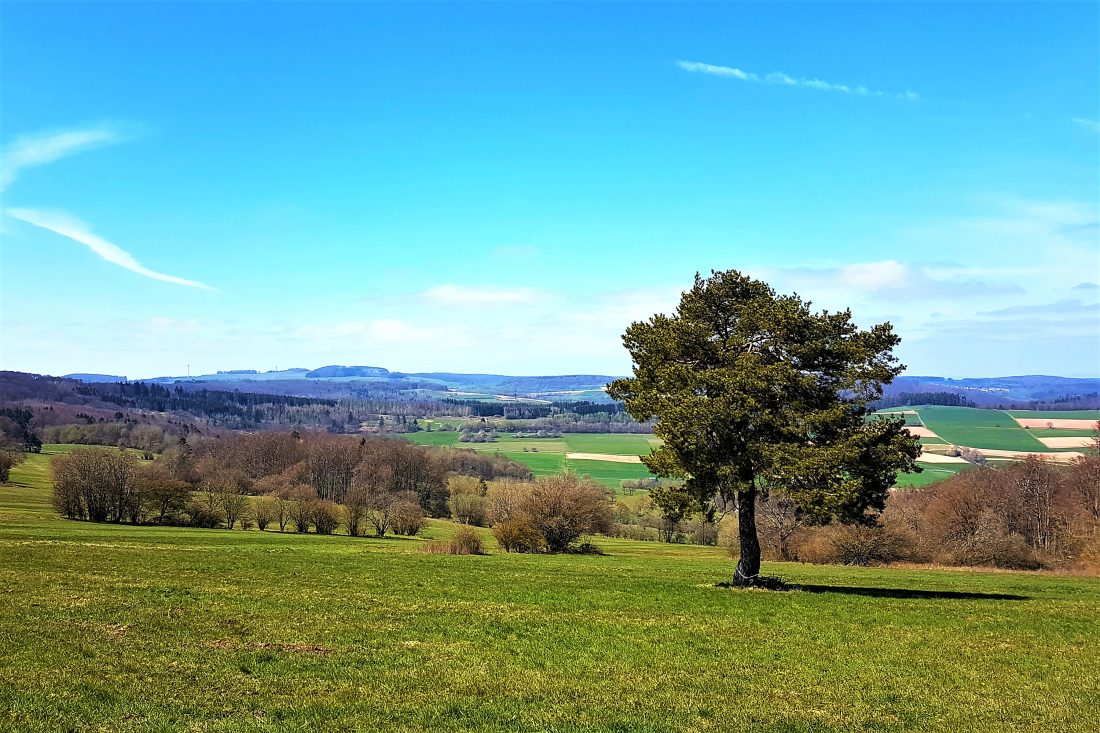 Description: Blick vom Eisenberg-Panoramaweg zum Knüll mit Knüllköpfchen und Knüllturm links im Hintergrund zu erkennen.