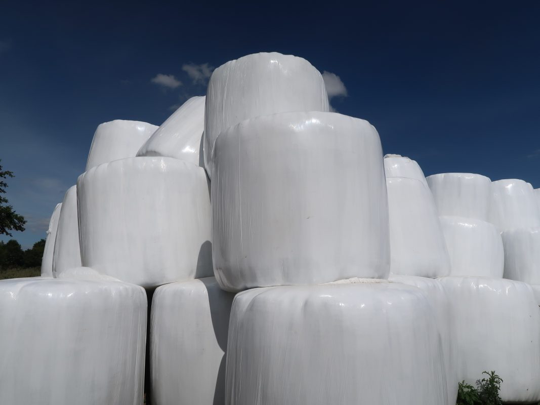 Description: Am Ortsrand von Leimsfeld Richtung Gebersdorf strahlen die in Folie eingewickelten Futtterballen im Nachmittagslich im strahlendem Weiß-